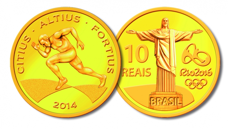 A moeda de ouro homenageia o Cristo Redentor e a luta olímpica, um dos esportes que representa o lema olímpico Citius, Altius, Fortius (mais rápido, mais alto, mais forte).