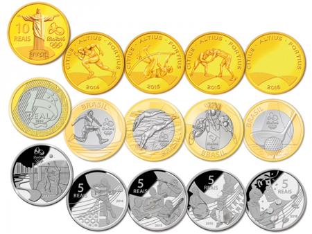 As moedas de prata apresentam paisagens onde o carioca pratica esportes como o remo, corrida, ciclismo e vôlei de praia. Os reversos contêm imagens da cultura e da natureza do país: mico-leão-dourado, orquídea, sambódromo e forró.