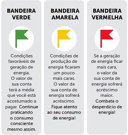 As bandeiras sinalizam, mês a mês, o custo de geração da energia elétrica que será cobrada dos consumidores. Não existe, portanto, um novo custo, mas um sinal de preço que sinaliza para o consumidor o custo real da geração no momento em que ele está consumindo a energia, dando a oportunidade de adaptar seu consumo, se assim desejar. Fonte: Portal Brasil/Aneel.