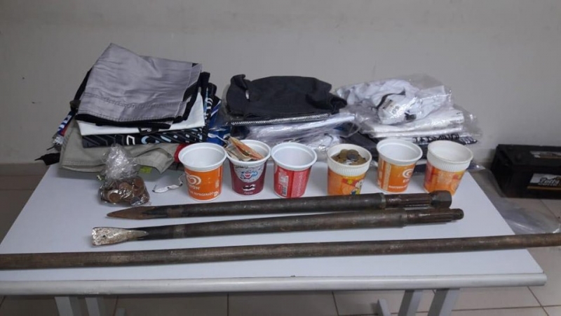 O grupo se refugiou num matagal, mas um acusado acabou preso. Com ele, a PM não encontrou nada. Contudo, no interior do Escort foram achados R$ 330 em moedas, 18 bermudas, 15 camisas e mais confecções. Os produtos equivalem a R$ 700. Foi achado pé-de-cabra e outras ferramentas utilizadas para arrombamento.