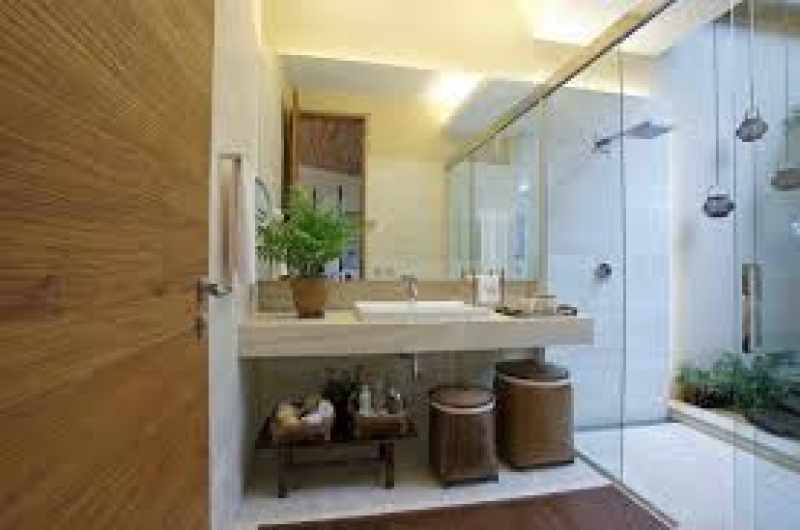 A escolha de madeira e acabamentos que imitam madeira faz com que o ambiente se torne mais aconchegante, contribuindo para a criação de um espaço mais vivo e acolhedor. Mesmo em pequenos banheiros é possível a colocação de vasos de plantas, trazendo mais vida e natureza ao local.