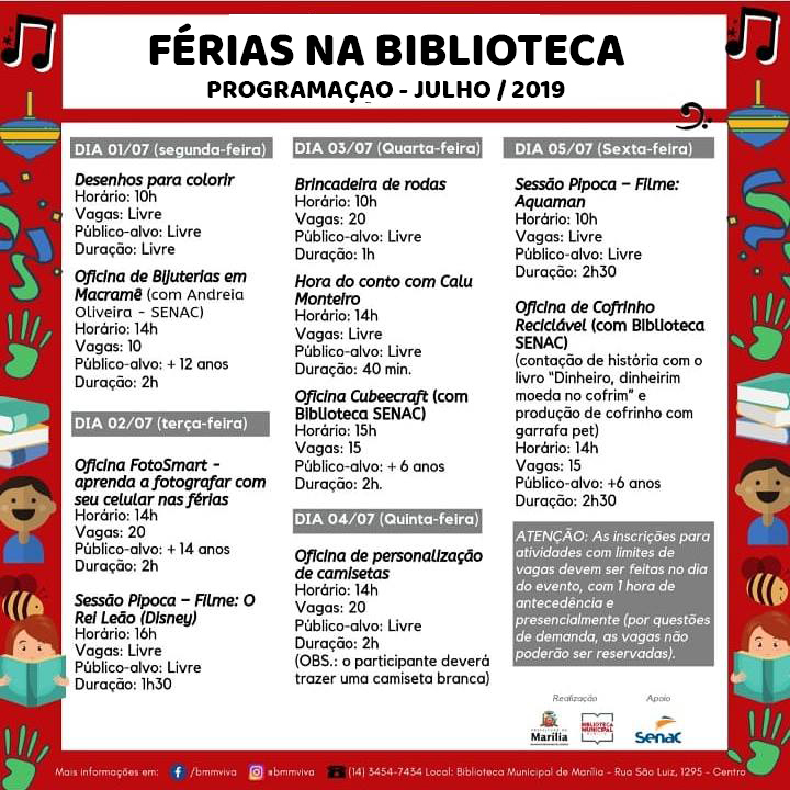 A Secretaria Municipal da Cultura realiza nesta semana uma programação especial de férias na Biblioteca Municipal, oferecendo atividades lúdicas, literárias e criativas às crianças e adolescentes, com entrada gratuita.