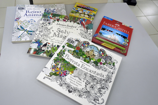 Para os que gostam de atividades relaxantes há também uma mesa com livros para colorir. Segundo a organizadora a idéia é propiciar aos alunos momentos de relaxamento através da pintura. "Depois de um dia puxado de trabalho é legal os alunos encontrarem esta opção de entrar em contato com atividades que ajudam a baixar a adrenalina e proporcionam a sensação de bem estar", comenta Aline.
