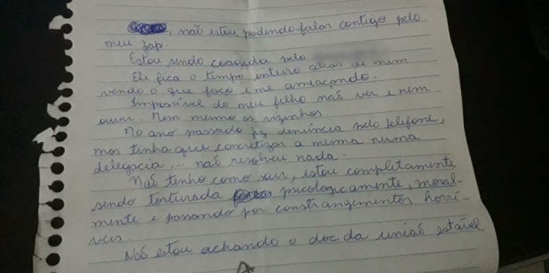 "Ontem, durante uma visita, numa distração do marido, o filho conseguiu fotografar o bilhete e trazer aqui à delegacia. Ele veio acompanhado de um outro parente, que também estava desconfiado da maneira retraída com que a vítima se comportava. Mas, como ela não tinha liberdade para usar o telefone nem receber visitas, porque o marido estava sempre ao lado, eles não tinham como saber exatamente o que estava se passando com a vítima", disse a delegada.