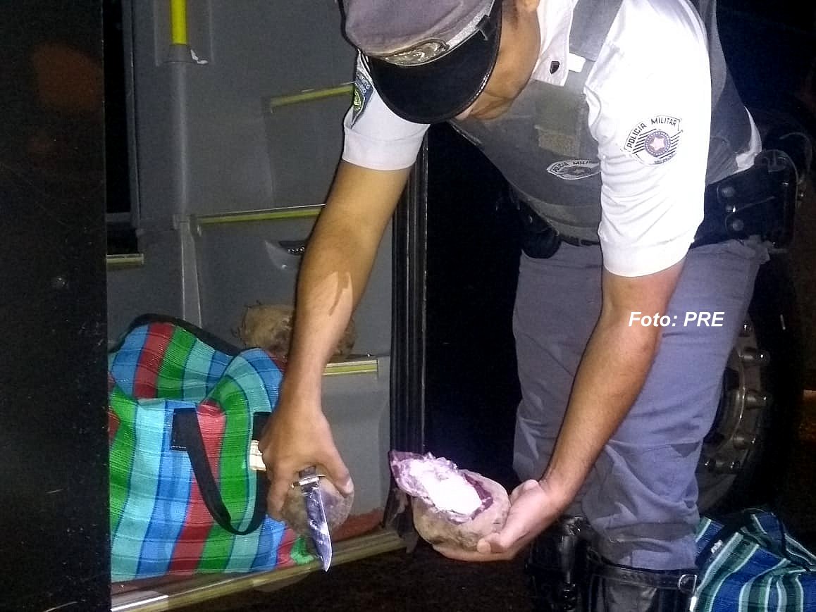 A Polícia Rodoviária Estadual apreendeu cerca de 26 quilos de cocaína escondidos dentro de várias beterrabas, que eram transportadas em malas no bagageiro de um ônibus na Rodovia Raposo Tavares (SP-270), em Assis. Três pessoas (bolivianos) foram presas.