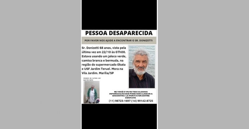 Mas, depois disso nunca mais foi visto. Os familiares já estiveram em todos os locais que seu Donizete costuma passar e não foim visto nestes dois dias.