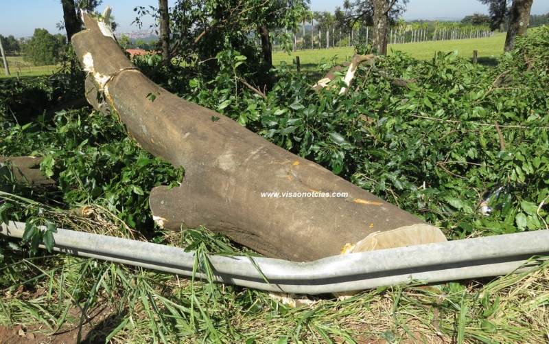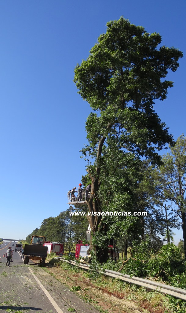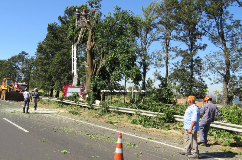 Após mais de duas horas de operação, equipes do Corpo de Bombeiros conseguiram cortar, há pouco, uma árvore com cerca de 15 metros de altura, que ameaçava cair sobre veículos que passavam pela rodovia SP-294 (Comandante João Ribeiro de Barros) entre o trevo e o distrito de Padre Nóbrega.