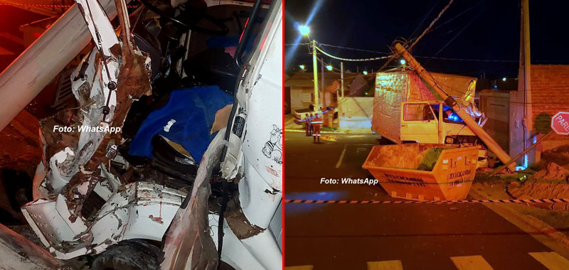 A cabine do caminhão ficou prestruída após o veículo chocar-se contra um poste de iluminação pública.