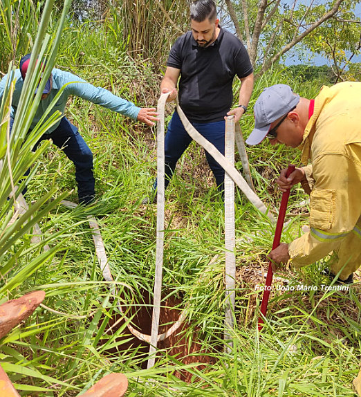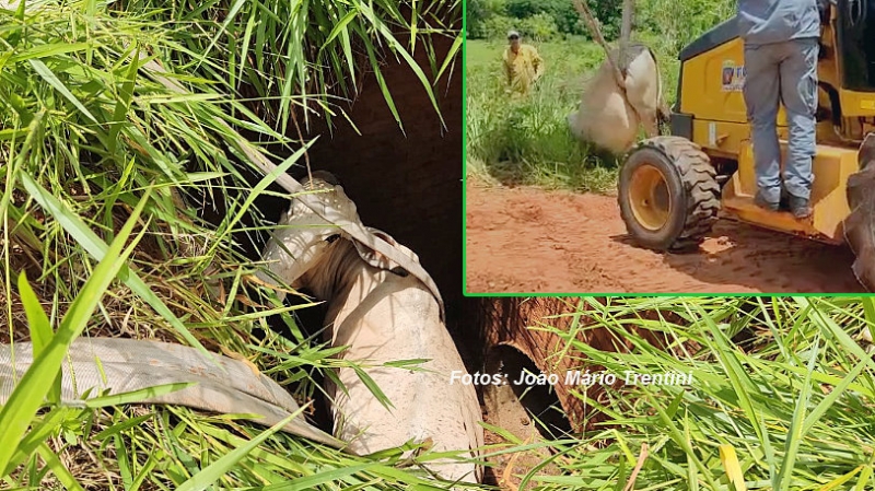 O acidente ocorreu ontem à tarde, numa estrada municipal. O bovino caiu no buraco de aproximadamente foi metros e não conseguia sair. O proprietário acionou inicialmente o Corpo de Bombeiros.
