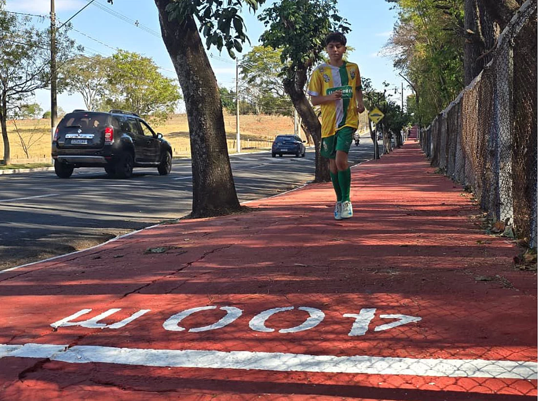 Toda a extensão da calçada do bosque municipal foi pintada com tinta de pista para caminhada, com demarcação a cada 100 metros, para que as pessoas que praticam caminhada tenham referência do percurso.