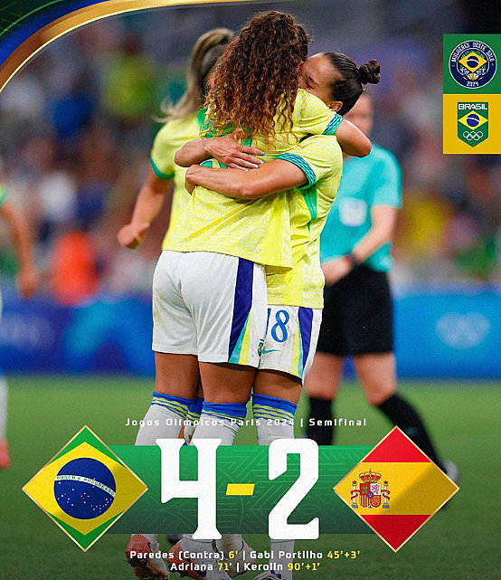 O Brasil garantiu a classificação para a decisão do torneio de futebol feminino dos Jogos Olímpicos de Paris (França) após derrotar a Espanha por 4 a 2, na tarde desta terça-feira (6) no estádio Velódrome, em Marselha, em confronto válido pelas semifinais da competição.