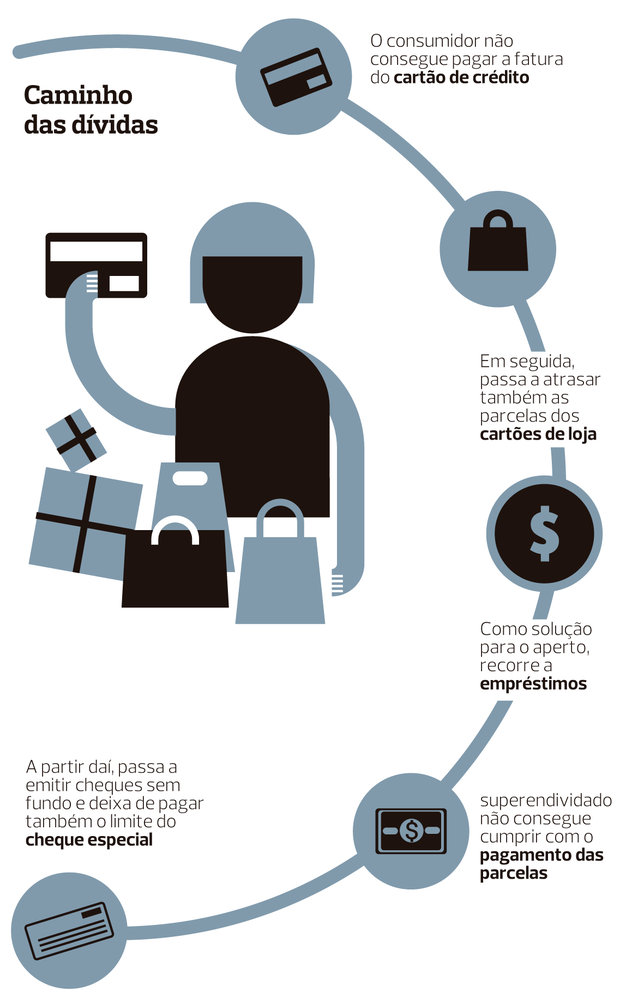 A pessoa vai sempre fazendo esse caminho: começa com o cartão de crédito, aí esgota o limite; passa para o cartão de loja e, quando se dá conta, não tem como honrar o pagamento das faturas e cai no empréstimo, que também não consegue honrar.