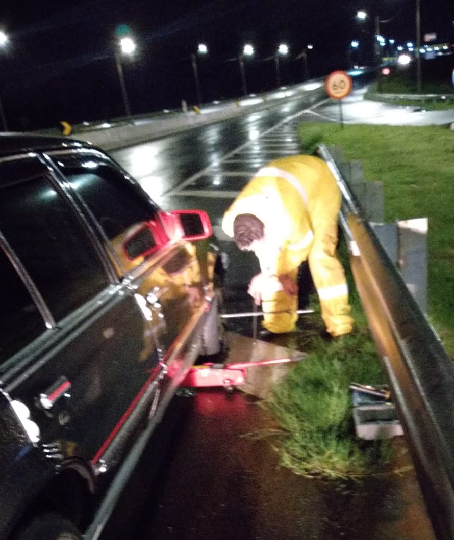 Ele estava voltando para casa quando foi surpreendido e por muito pouco o seu veículo não capotou. Célio teve que aguardar o socorro da Entrevias para trocar a roda.