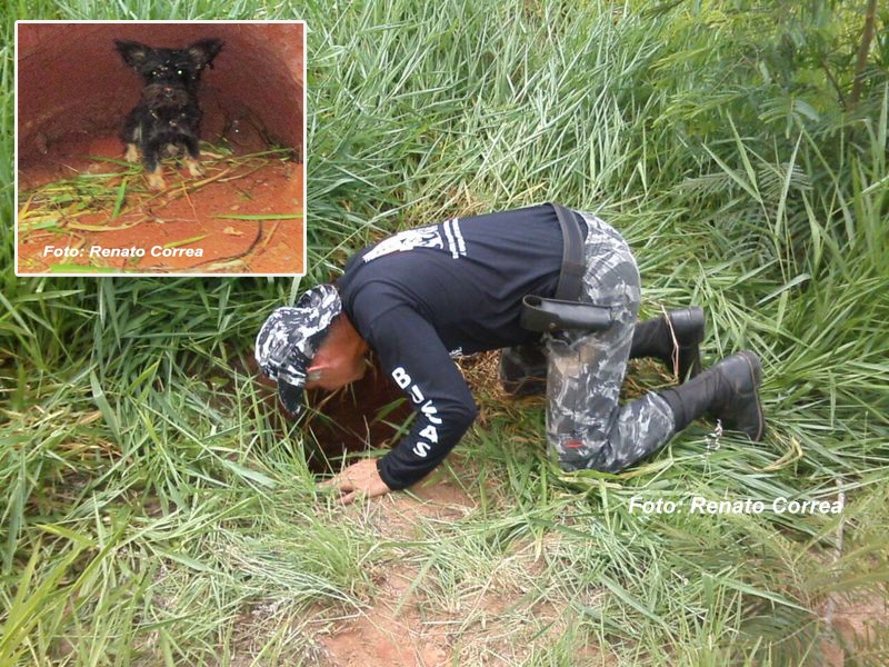 Durante as buscas à mulher desaparecida desde ontem no bairro Santa Antonieta, um dos integrantes da equipe Anjos da Guarda/SICOE deparou com um salvamento inesperado: de um cãozinho que havia caído num buraco com cerca de 2,5 metros de profundidade, atrás da indústria Bel Chocolates, no distrito Industrial.