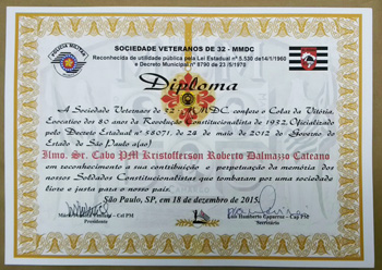 A honraria foi entregue pelo presidente da Sociedade Veteranos de 32/MMDC, Coronel PM Mário Fonseca Ventura.