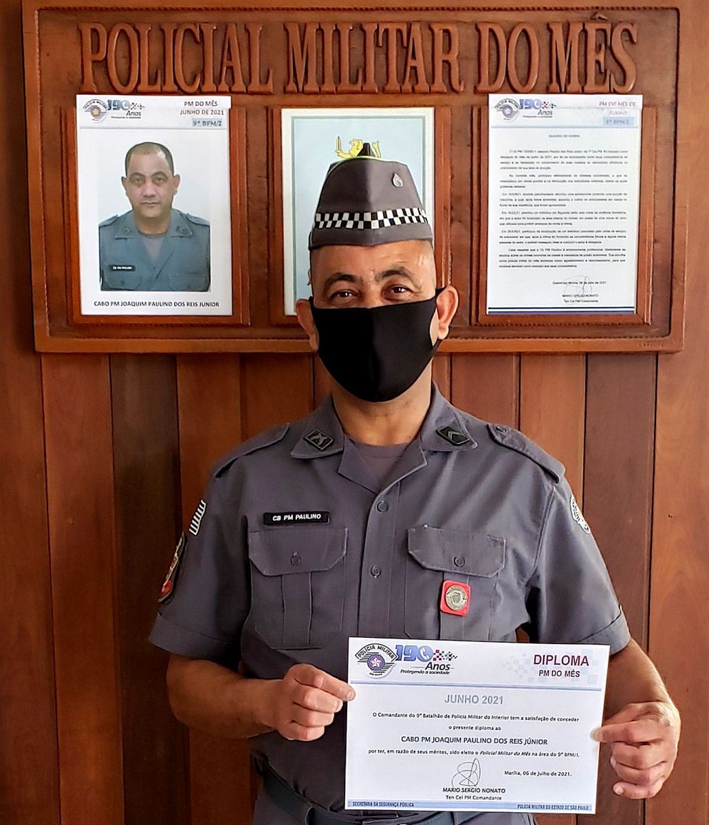 O cabo Joaquim Paulino dos Reis Júnior, da 1ª Companhia da Polícia Militar, foi destaque do mês de junho, em virtude de ocorrências que envolveram casos de violência doméstica e estupro de vulnerável, registradas em Marília. A homenagem foi prestada pelo 9º Batalhão da Polícia Militar, com sede em Marília.
