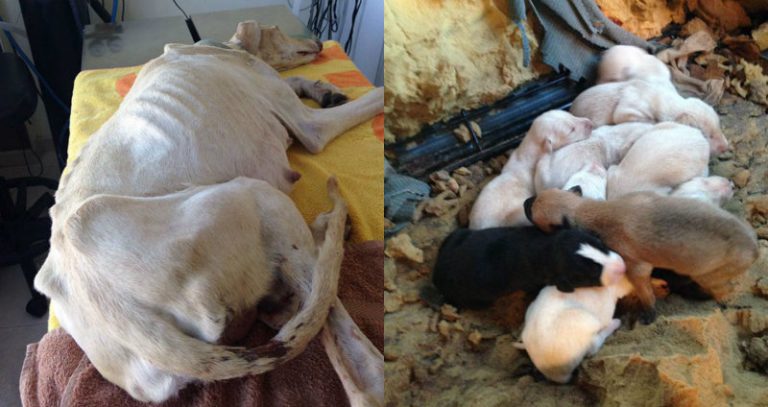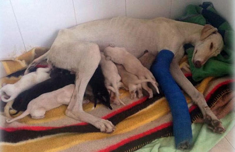 Uma cachorrinha subnutrida, que estava com a pata direita quebrada e subnutrida, andou mais de três quilômetros para resgatar seus filhotes.