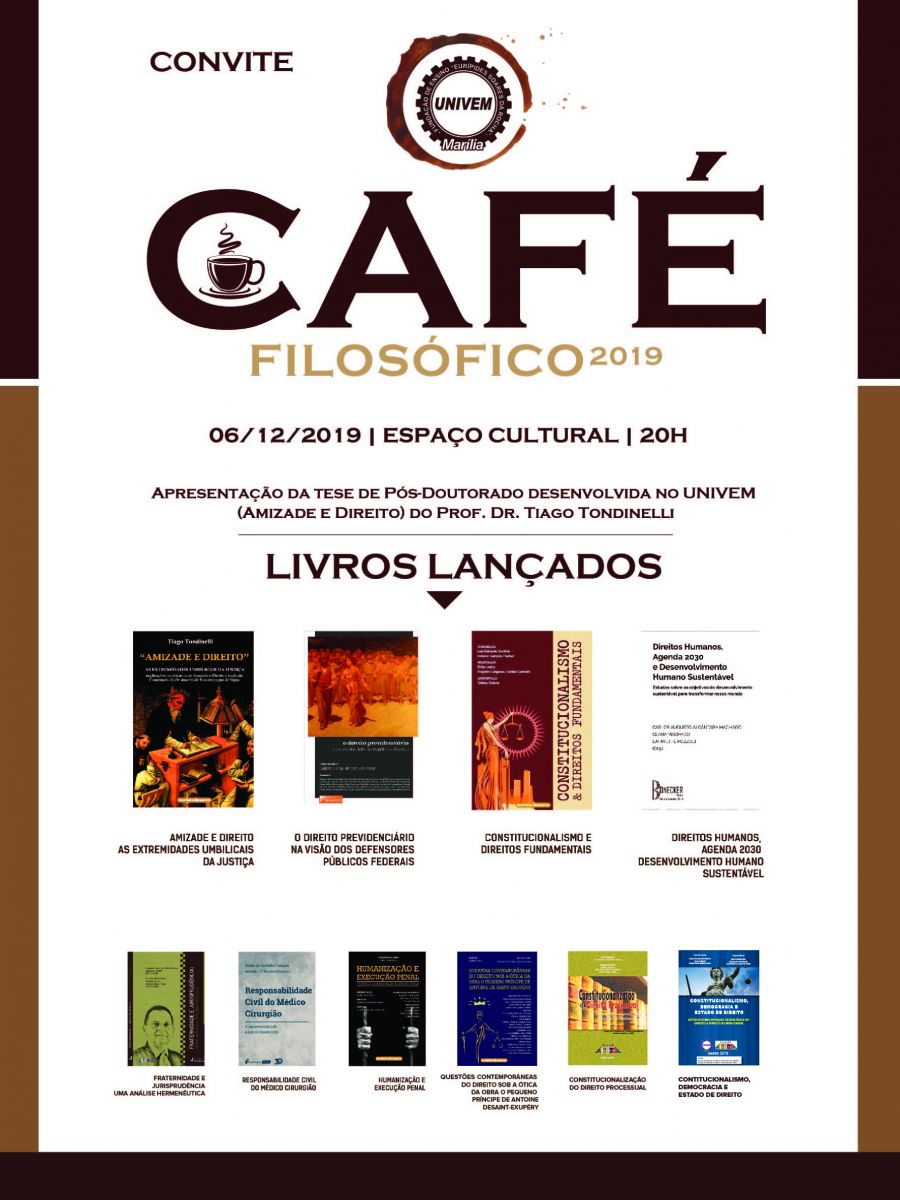O Programa de Mestrado em Direito do Centro Universitário Eurípides de Marília - UNIVEM, coordenado pelo Prof. Dr. Lafayette Pozzoli, promove nesta sexta-feira, dia 6, às 20 horas, no Espaço Cultural da Instituição, o Café Filosófico 2019, com apresentação da tese de Pós-Doutorado desenvolvida na Instituição, “Amizade e Direito”, do Prof. Dr. Tiago Tondinelli, lançamento de livros e coquetel para os convidados.