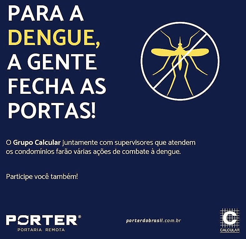A campanha contra a dengue do Grupo Calcular e Porter Portaria Remota ocorrerá nos quase 100 condomínios comerciais e residenciais clientes das empresas, a partir de novembro. Os folhetos explicativos já foram impressos e a equipe de supervisores está recebendo orientação para realizar as vistorias das áreas comuns.