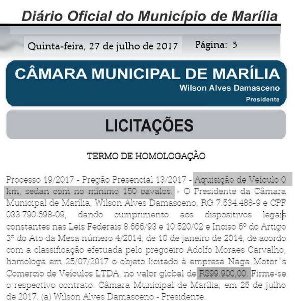 De acordo com a licitação (Processo 19/2017 - Pregão Presencial 13/2017), o Legislativo mariliense abriu possibilidade de que qualquer revendedora do país oferecesse um Veículo 0 km, sedan com no mínimo 150 cavalos.