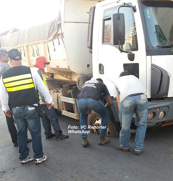 Mas, quando um deles passou por um trecho em que havia um remendo no asfalto, afundou e uma das rodas dianteiras ficou presa. Tudo indica por causa de um novo vazamento de água ou por falta de uma melhor compactação do solo).
