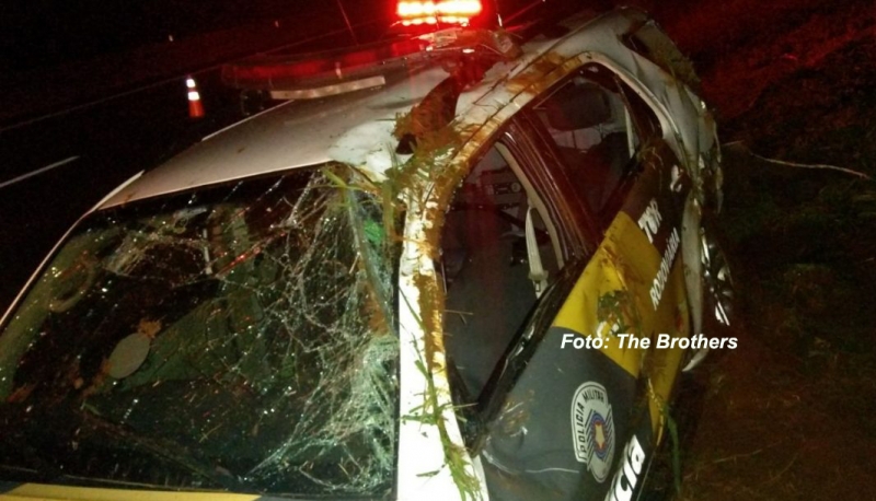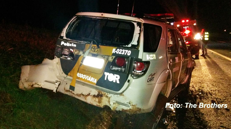 Com o impacto, a viatura da Polícia Rodoviária (TOR) ficou praticamente destruída.