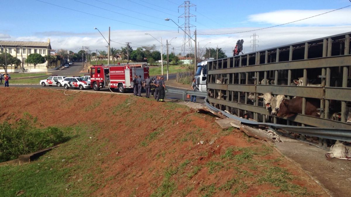 Um caminhão carregado com boi tombou, na tarde desta quinta-feira (27) em Bauru.