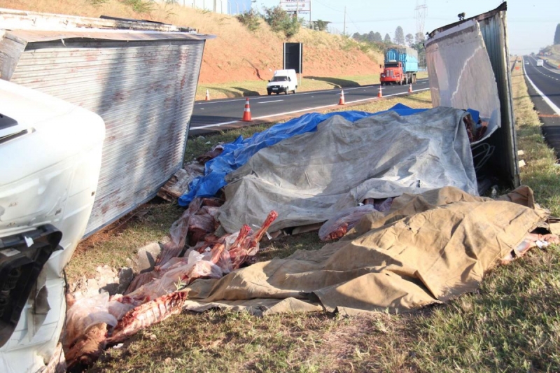 O motorista, que não teve a identidade divulgada, teria perdido o controle da direção do veículo e tombado no canteiro central da rodovia, espalhando a carne bovina pelo local.