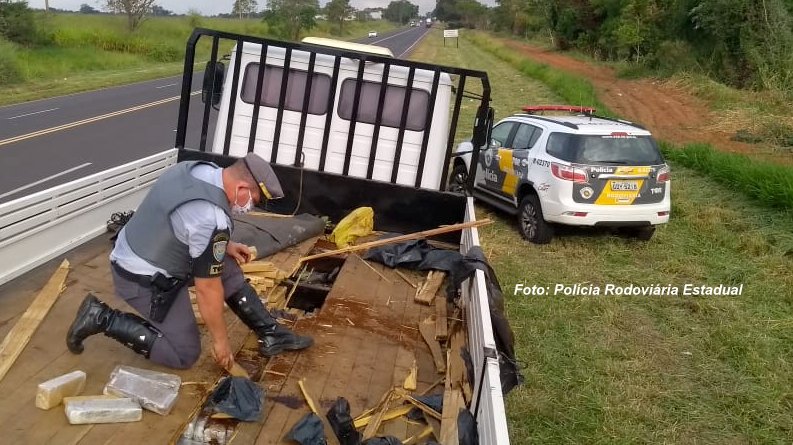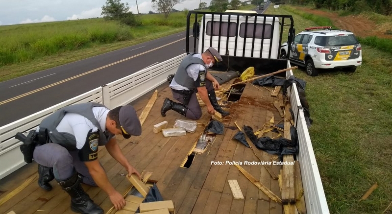 Dessa forma, decidiram fazer uma varredura no veículo, mesmo estando vazio, constatando que havia um fundo falso na carroceria. O local estava lotado de tabletes de maconha.