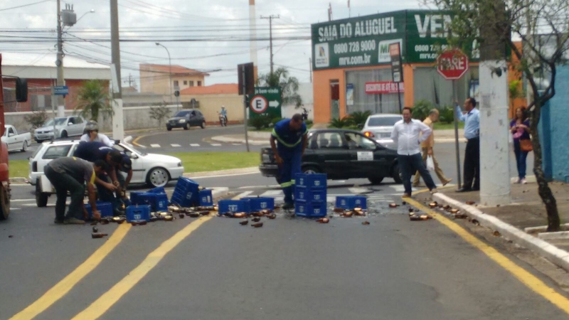 Um caminhão carregado com vasilhames de vidro de cerveja espalhou parte de sua carga há pouco em uma rotatória na avenida da Saudade, próximo ao Cemitério.