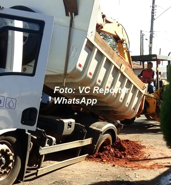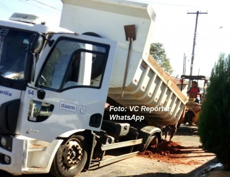 Um caminhão basculante do DAEM (Departamento de Água e Esgoto de Marília) ficou preso no buraco que a própria autarquia havia aberto no dia anterior para fazer o