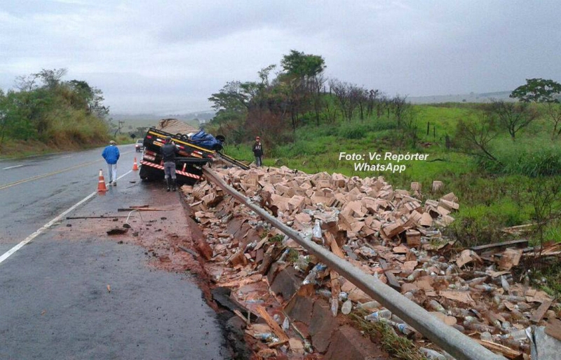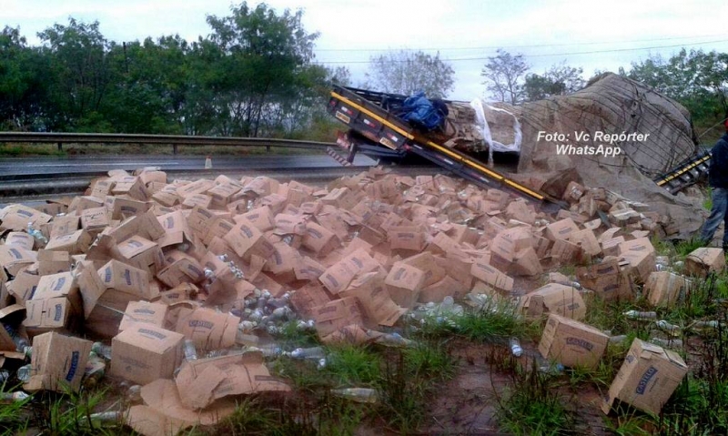 Equipes da Polícia Rodoviária Estadual e também do DER (Departamento de Estradas de Rodagem) foram acionadas. Parte da carga ficou espalhada além da pista e também na valeta. Um outro caminhão esteve no local para fazer o transbordo das caixas de vinagre. O trânsito de veículos já está normalizado.