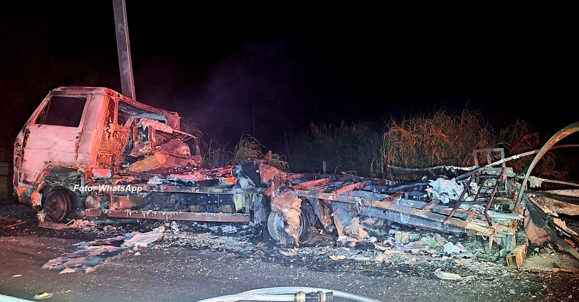 Um caminhão tipo baú ficou completamente destruído por um incêndio agora à noite na SP-333, próximo a Marília. O fogo teria sido provocado por uma pane elétrica. Apesar dos estragos, ninguém sofreu ferimentos.