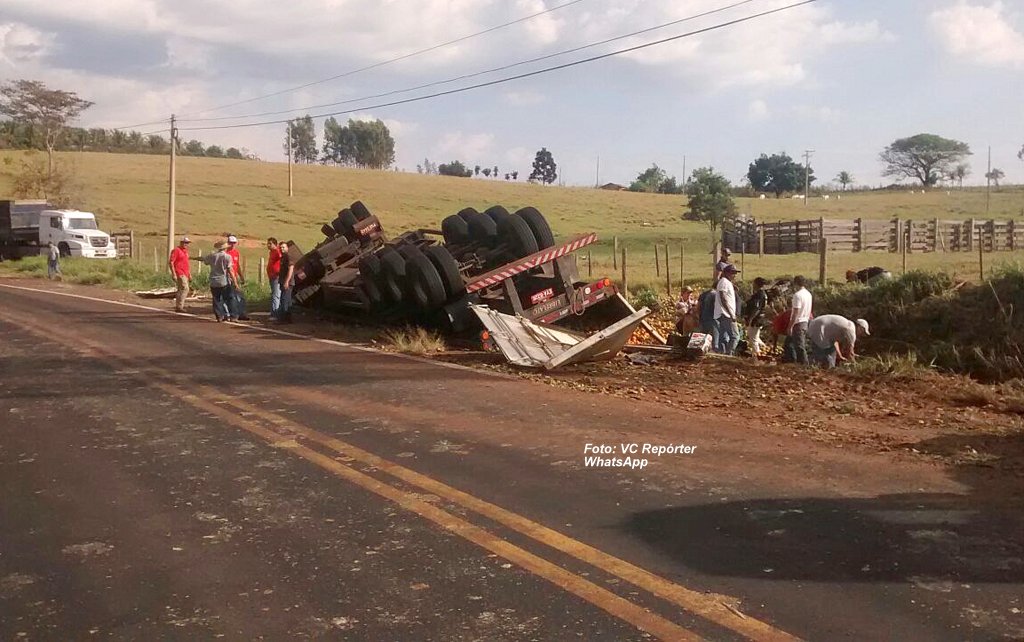 Equipes do DER (Departamento de Estradas de Rodagem) e da Polícia Rodoviária Estadual fazem nesta manhã (17) uma operação para retirar o caminhão carregado com laranjas que tombou no final da tarde de ontem, próximo a Álvaro de Carvalho. Apesar dos estragos, o motorista não sofreu ferimentos.