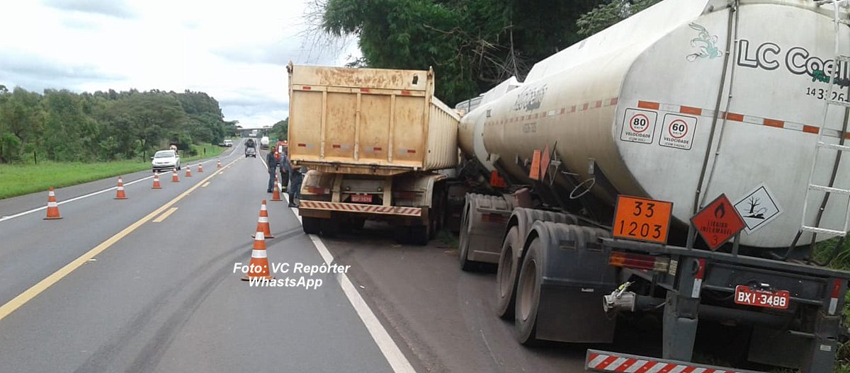 Parte da carga ficou espalhada pela pista enquanto que do outro veículo foi feito o transbordo.