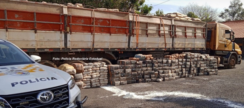 A Polícia Rodoviária Estadual fez apreensão de um grande carregamento de drogas na Central de Polícia Judiciária de Assis. São diversos fardos de maconha e skank que estavam sendo transportados numa carreta. A apreensão pode chegar a 2,5 toneladas. O motorista foi preso em flagrante.