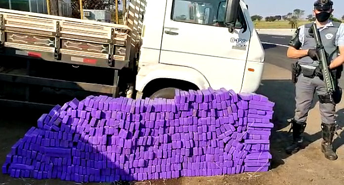 A Polícia Rodoviária Estadual apreendeu no começo da tarde deste sábado um grande carregamento de maconha. A droga estava sendo transportada no fundo falso de um caminhão e tinha como destino a capital paulista.