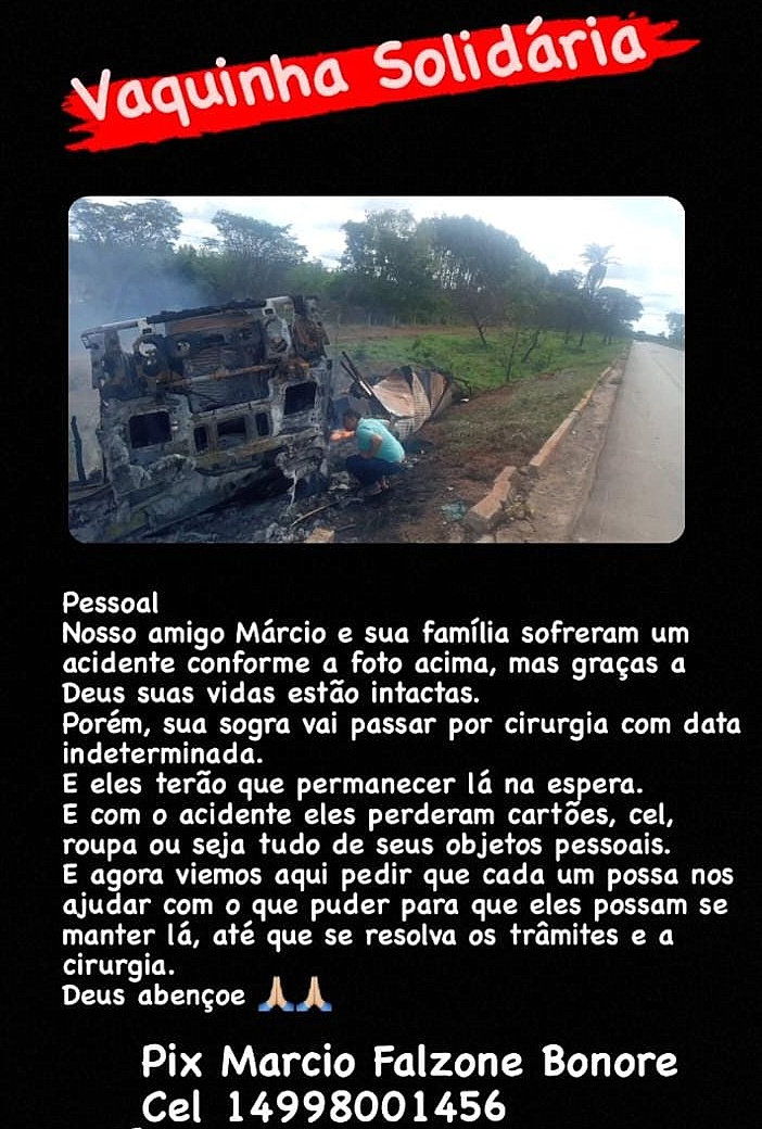 O caminhoneiro mariliense Marcio Falzoni Bonore, que viajava com a família para Pernambuco, sofreu um grave acidente nesta semana ao tombar o veículo que em seguida pegou fogo. Três pessoas sofreram ferimentos e o que é pior: perderam tudo o que tinham, desde documentos, roupas, além da própria carreta. Uma campanha está sendo realizada para ajudar a família.