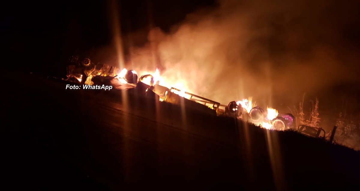 Veículo tombou e pegou fogo. Ocupantes sofreram ferimentos e perderam tudo