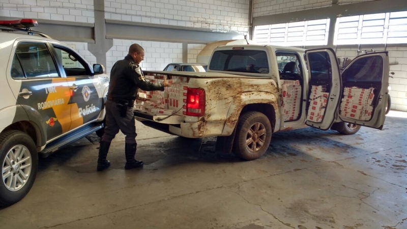 Ao perceber os policiais, o motorista de 22 anos ainda tentou fugir, mas perdeu o controle e acabou caindo numa canaleta de água. Além do cigarro contrabandeado, os patrulheiros descobriram que a caminhonete, ano 2013, era dublê (havia sido furtado em Presidente Prudente - placa correta NSD 7368).