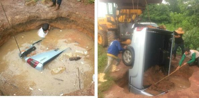 Uma caminhonete foi totalmente engolida por um buraco de 7 metros de profundidade em uma estrada na zona rural de Cáceres, a 220 km de Cuiabá. De acordo com a Secretaria de Obras de Cáceres, a cratera se formou após excesso de chuvas na região. Duas pessoas estavam no veículo e saíram a tempo antes que a caminhonete afundasse completamente.
