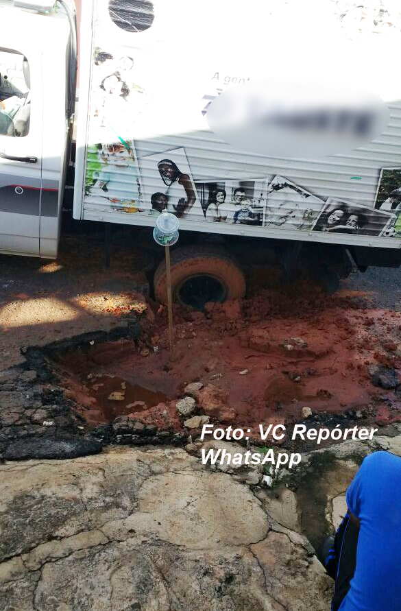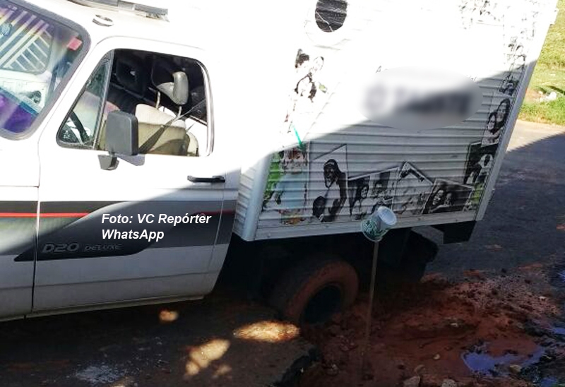 Nesta tarde, uma caminhonete de um tradicional supermercado da cidade fazia entregas naquela região quando o motorista foi surpreendido e ficou enroscado. As rodas traseiras (lado esquerdo) caíram no buraco aberto e não teve como sair.