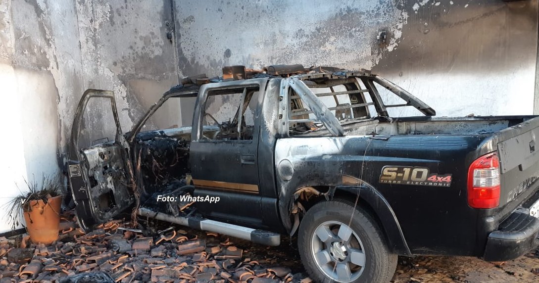 A caminhonete estava estacionada na garagem e, por volta das 6 horas, o proprietário sentiu forte cheiro de fumaça e, ao levantar, deparou-se com o fogo já atingindo parte da residência.