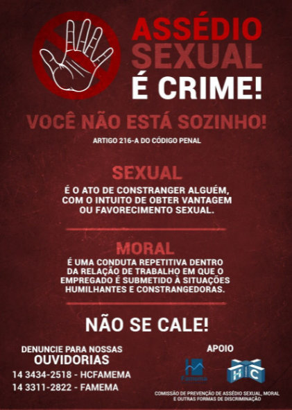 A FAMEMA (Faculdade de Medicina de Marília) e o HC deflagram uma campanha institucional preventiva contra assédio sexual, moral e outras formas de discriminação.