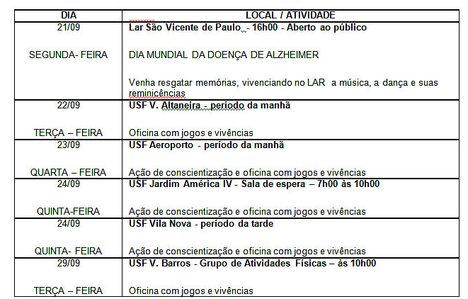 Atividades com palestras, jogos de memorização, oficinas com danças e músicas serão desenvolvidas no Lar São Vicente de Paulo e também em algumas Unidades de Saúde da Família.