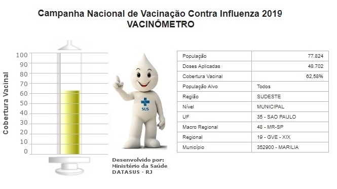 A Secretaria Municipal da Saúde de Marília alertou a população para a proximidade do fim do prazo da Campanha Nacional de Vacinação Contra a Gripe, que acaba dia 31 deste mês. Desde o início da mobilização, foram aplicadas 48.491 doses na cidade (62% do total). O objetivo é aumentar esse número em pelo menos mais 22 mil pessoas.