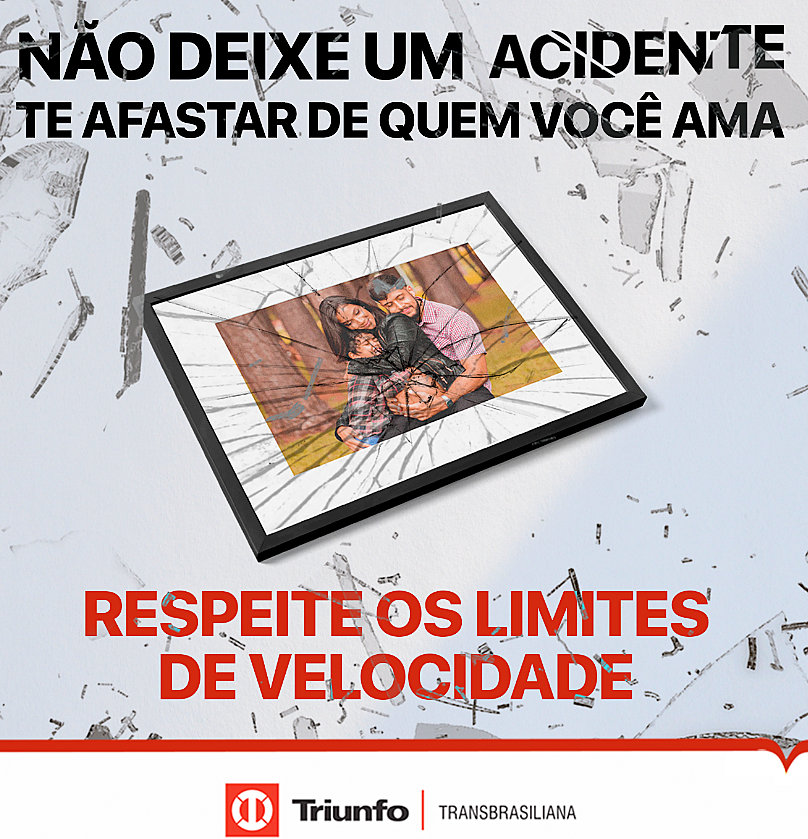 Diante dessa realidade e com o objetivo de chamar atenção dos usuários e da sociedade em geral sobre os perigos de dirigir em alta velocidade, a Triunfo Transbrasiliana, concessionária que administra a BR-153, lança neste mês de fevereiro a campanha educativa “Não deixe um acidente te afastar de quem você ama”.