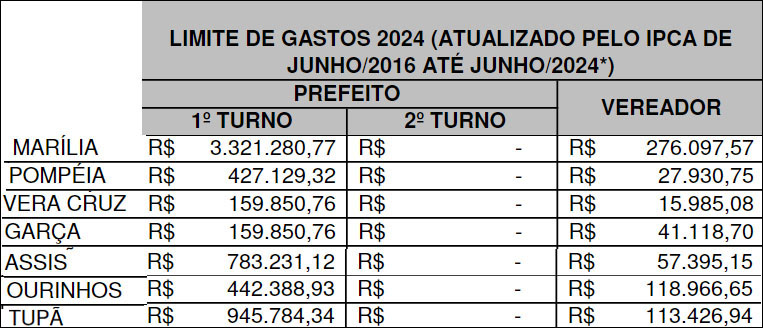 Na campanha eleitoral em Marília, começou a ser definida desde o fim de semana, com a realização das convenções municipais, os candidatos a prefeito (após registro no TRE) poderão gastar até R$ 3,3 milhões enquanto que cada candidato a vereador terá um limite de gastos de até R$ 276 mil.