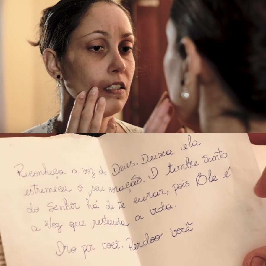 "Reconheça a voz de Deus. Deixa ela estremecer o seu coração. O timbre santo do Senhor há de te curar, pois Ele é a voz que restaura a vida. Oro por você. Perdoo você", diz o bilhete deixado pela mulher no clip.