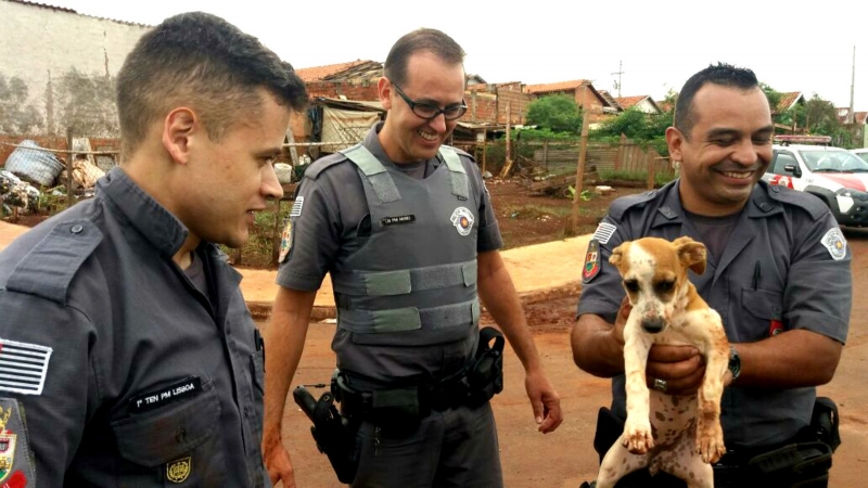 Durante a patrulha pelas ruas do Conjunto Habitacional Rita Emboava, apoiada por com cães farejadores, um cachorrinho da localidade começou a seguir o grupo da PM e acabou caindo em um buraco.